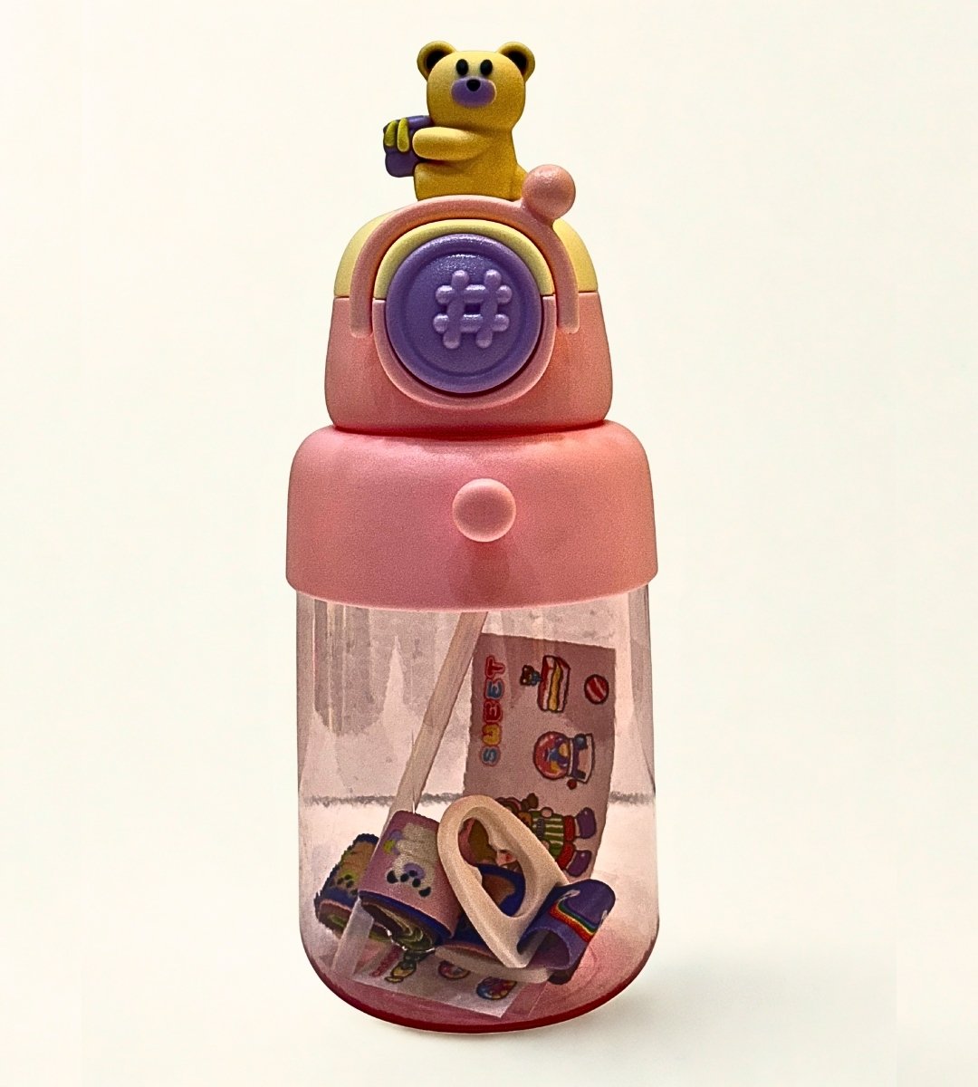 This cute kids water bottle has a cartoon bear design on the lid. It comes with a straw for easy drinking. Perfect for school, travel, and daily use.