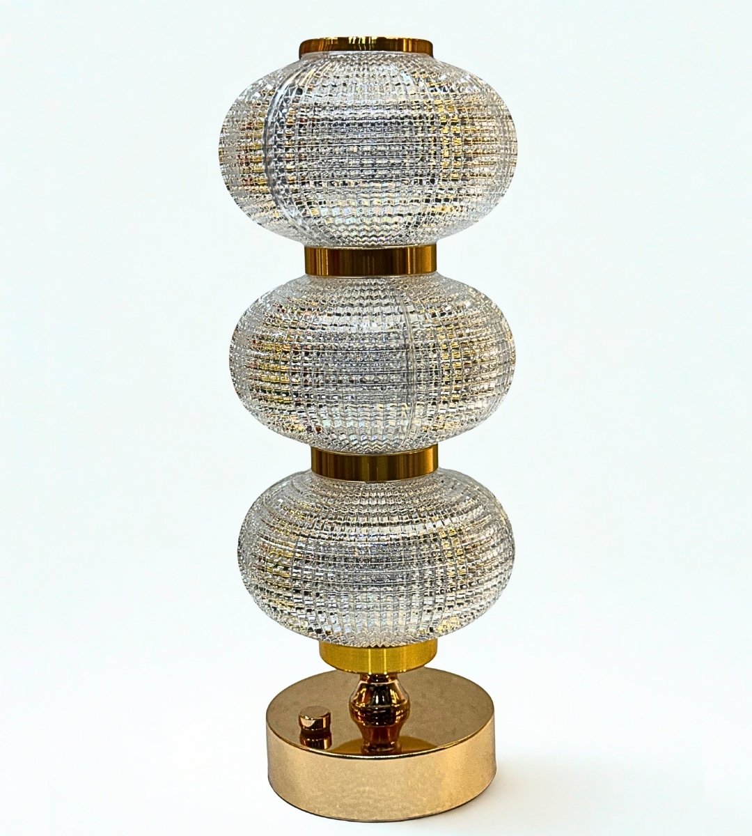 This golden crystal table lamp is designed to bring elegance and style to any room. It features three crystal-patterned globes stacked on top of each other, creating a modern and premium look. When switched on, the crystal glass sparkles beautifully and spreads soft, warm light. The golden metal base adds a rich and classy finish, making the lamp perfect for home décor.