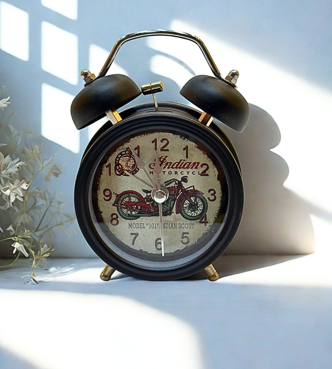 Old-Style Metal Table Clock with Vintage Motorbike Dial
